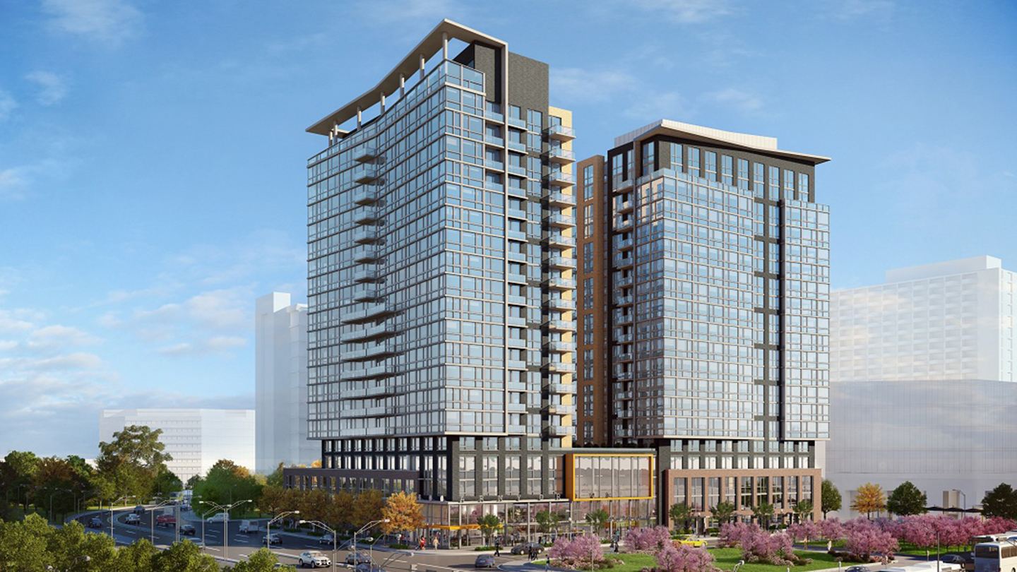 Planos de vidrio, ladrillo rojo y ladrillo negro articulan el basamento, y el desarrollo y remate de las dos torres perpendiculares que ocuparan en la primera fila del frente urbano de Rosslyn.