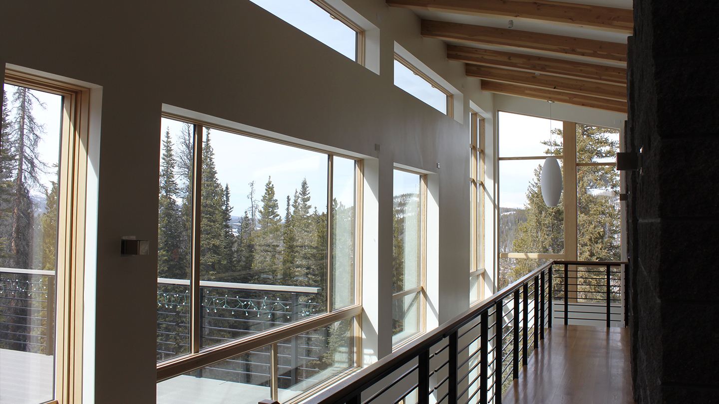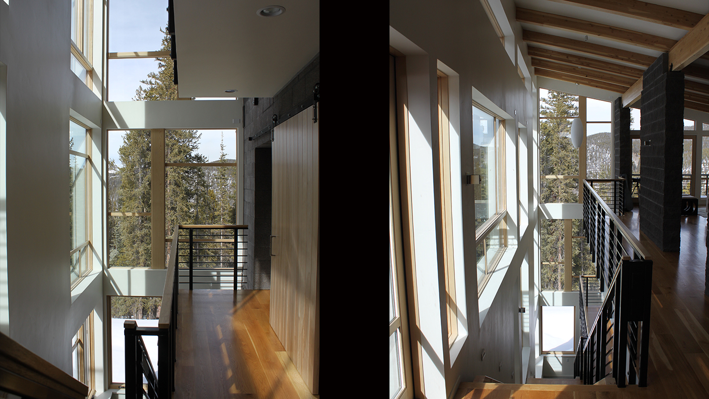 La cara oeste tiene una fachada vidriada sobre la cual se ubica el volumen de la escalera en todo su desarrollo. De esta manera se busca introducir la presencia del sol del oeste y el bosque dentro de la circulación y la vida cotidiana de la casa.