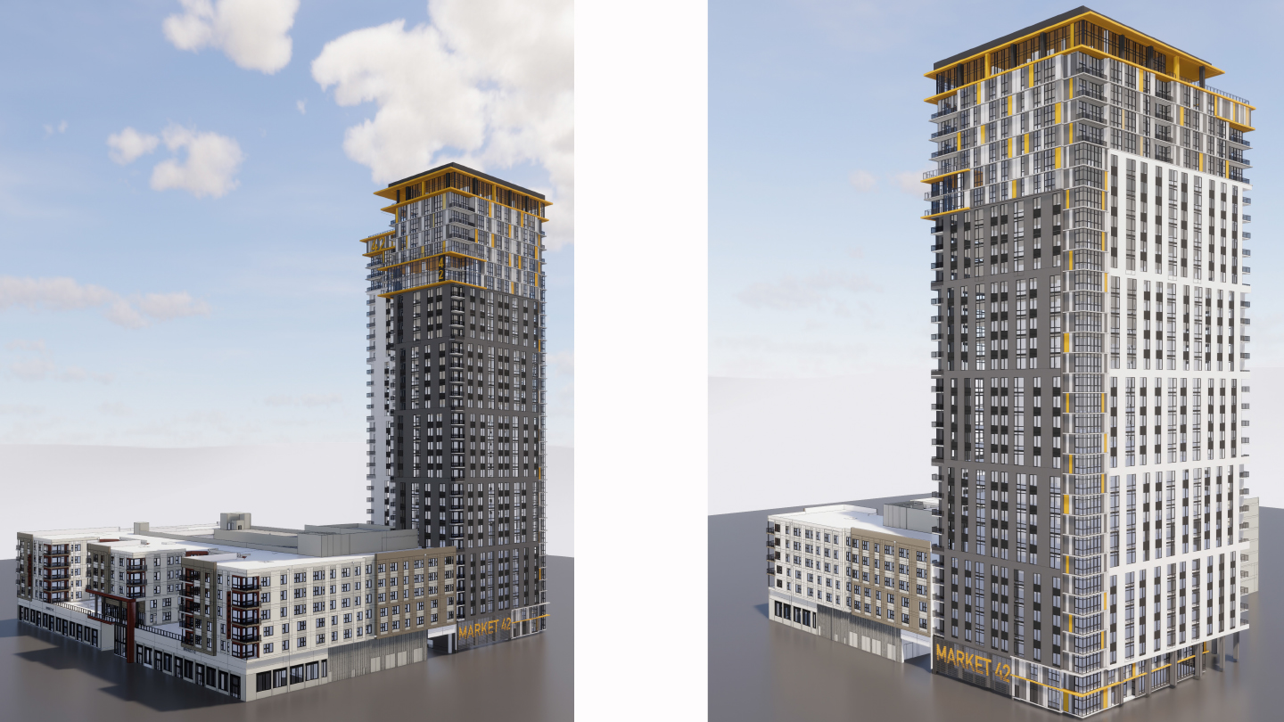 Este proyecto de 550 unidades y usos mixtos ocupara una manzana frente a la nueva lÃnea de tranvÃa adyacente al campus de la Universidad de Carolina del Norte en el centro de Charlotte. Es un proyecto de múltiples componentes: un garaje para 900 autos, un edificio residencial de 7 pisos, un edificio residencial de 33 pisos y un edificio de oficinas de 10 pisos. Hacia el sur, el podio comercial esta orientado hacia la calle privada-peatonal paralela al tranvÃa y su nueva estación. Vidrio y una fuerte banda horizontal separan la base y el edificio residencial. Una abertura con un Paseo divide la cuadra, conecta la calle con el garaje y crea un contrapunto con el volumen vidriado de las zonas comunes. El edificio residencial desarrolla un volumen en forma de “E†con patios abiertos al sol y las vistas. Las fachadas están articuladas con volúmenes contrastantes claros y oscuros, y acentos de color alternados. Hacia el norte, el edificio alto es una extrusión en forma de “Lâ€, la arquitectura celebra la volumetrÃa acentuando la diferencia entre las alas y el centro del edificio. Las alas tienen una expresión monocromática, sólida y vertical, mientras que el centro se expresa horizontal y con patrones mas vibrantes y coloridos. Fuertes voladizos de color y grafica de gran escala, acentúan las áreas de usos comunes en la base, desarrollo y remate del edificio, definiendo la futura identidad del edificio en la silueta urbana. Diseñado para KTGY Group