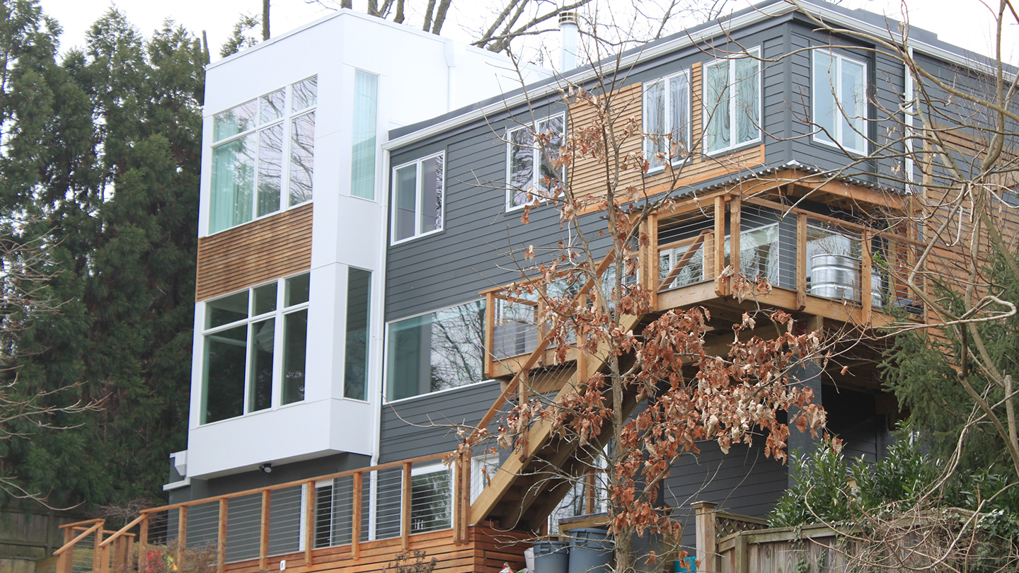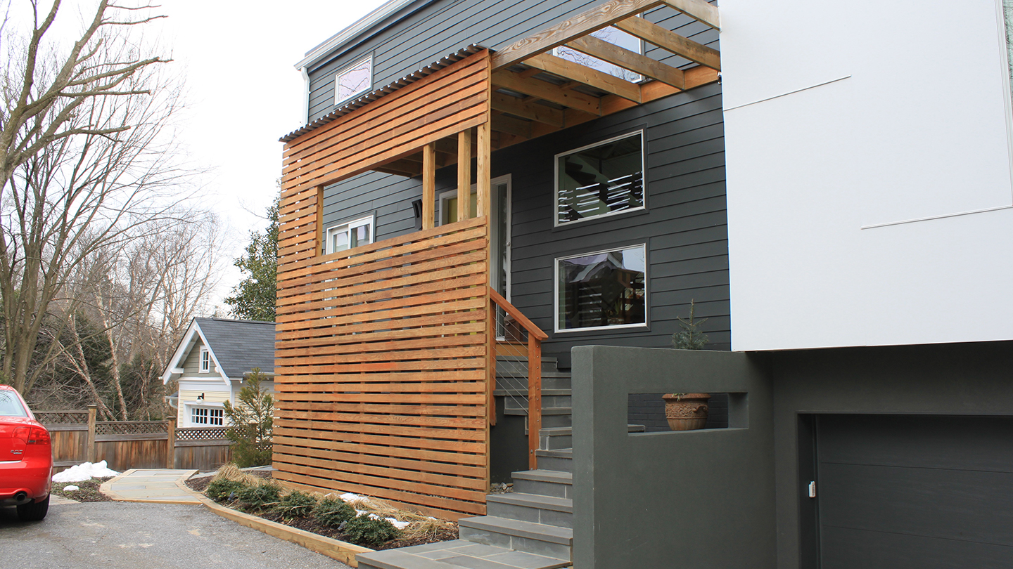 Cubos de distintos colores, profundidades y texturas crean articulación en la fachada; pantallas de machimbre de cedro crean privacidad en los espacios exteriores.