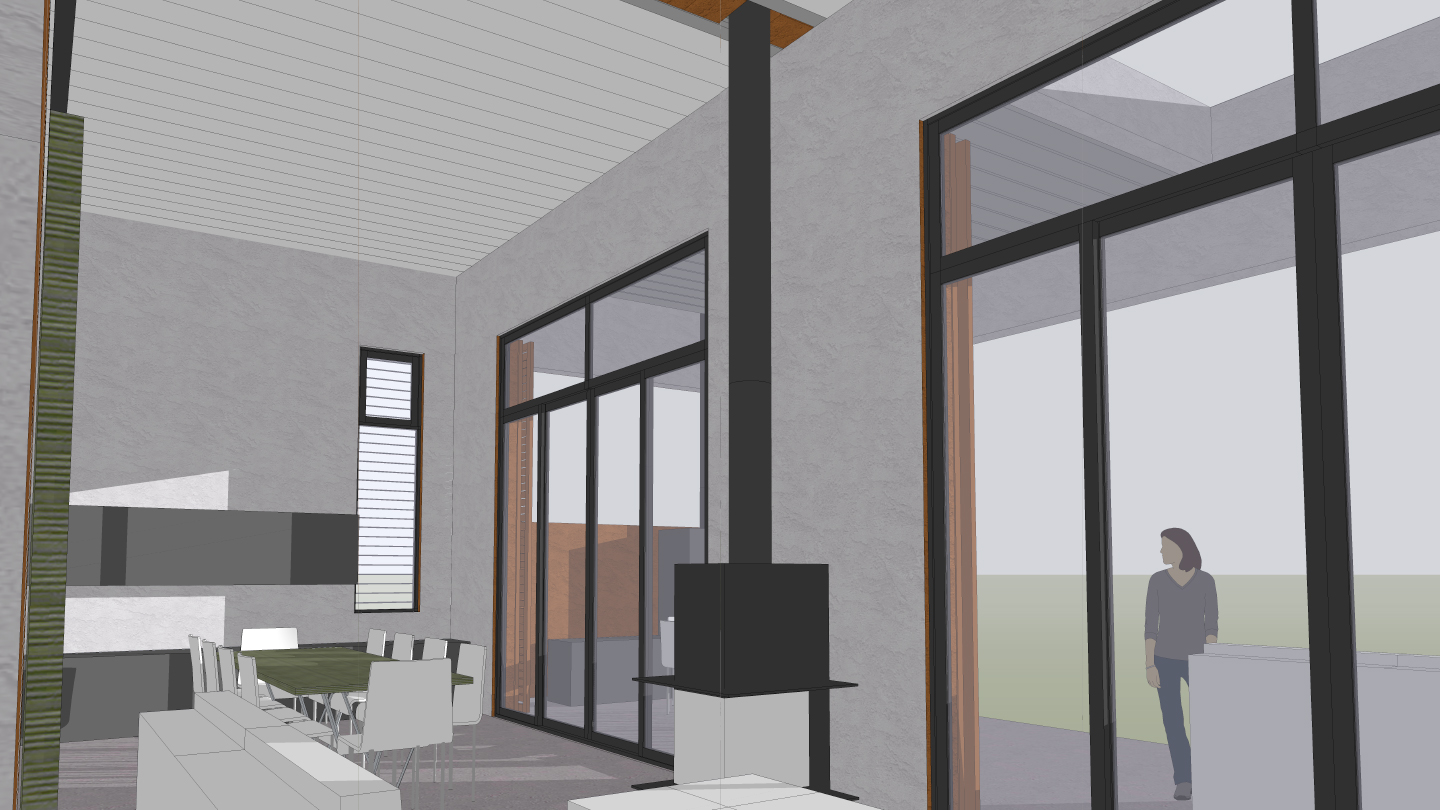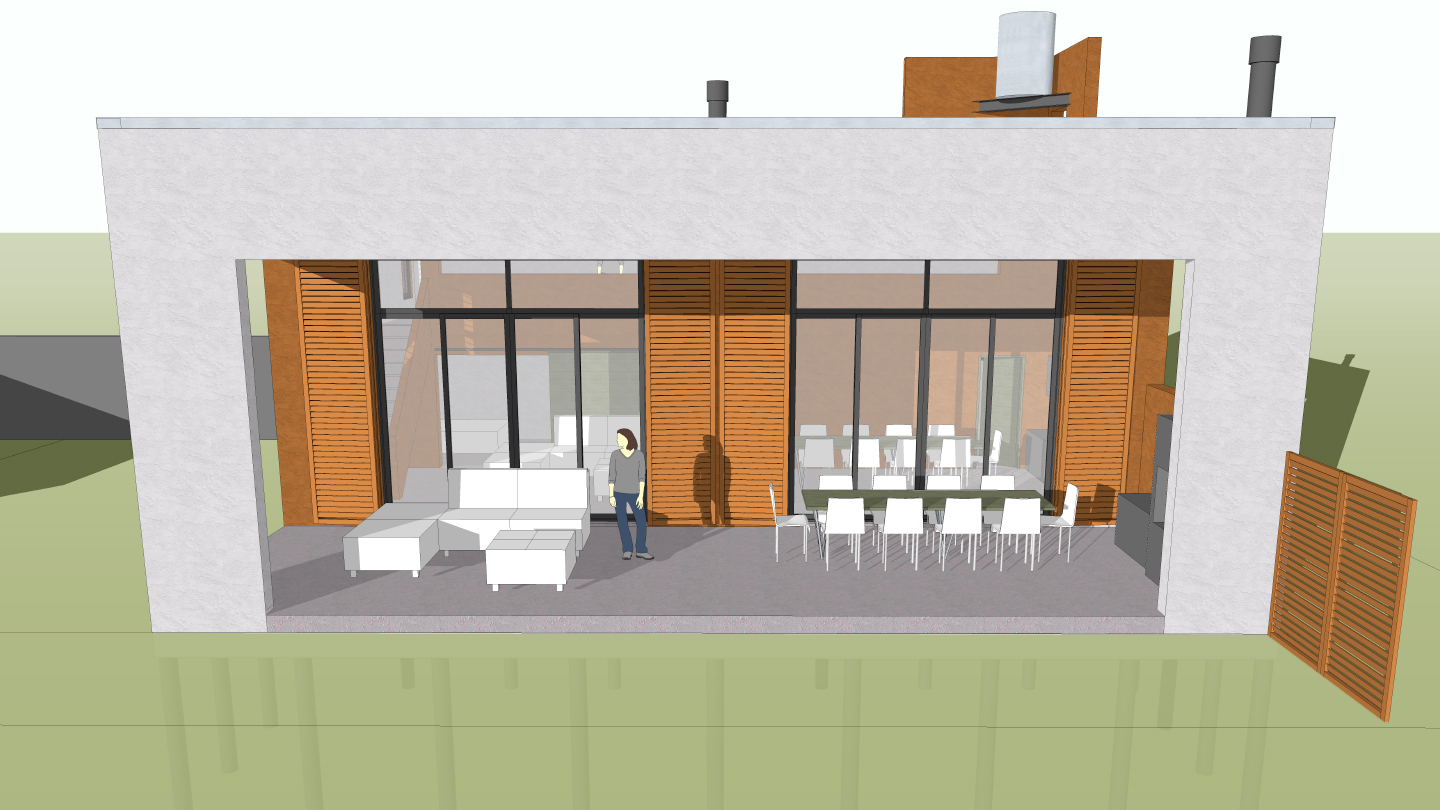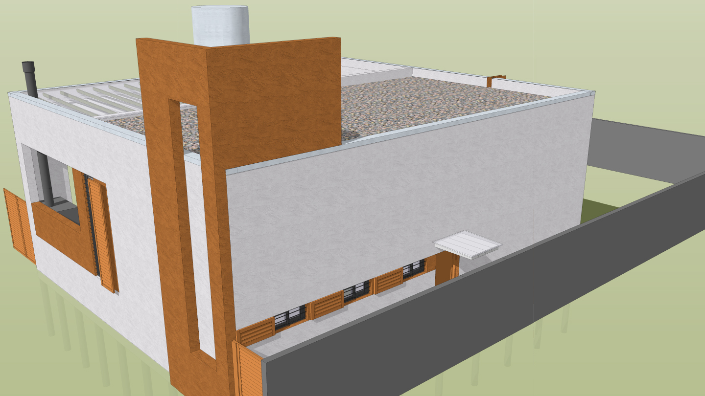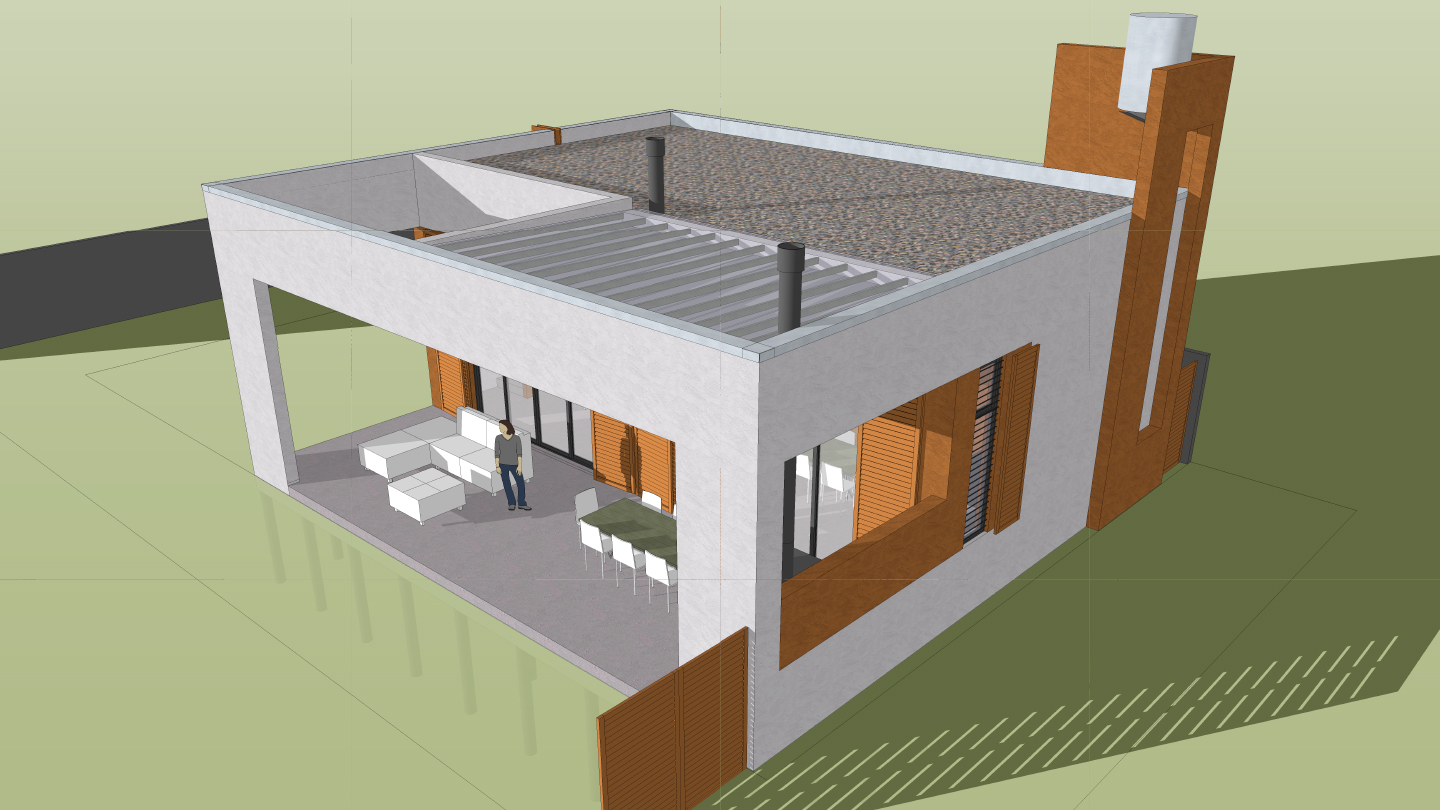 Un prisma de doble altura contiene espacios de dormir y servicio en alturas simples y espacios de estar en doble altura. Los espacios de estar son de tres tipos: interior cubierto, exterior abierto, y exterior semi cubierto con luz tamizada por rendijas en el techo. La casa se abre hacia el Norte y se cierra hacia el sur, donde se ubican las áreas de servicio y el acceso.