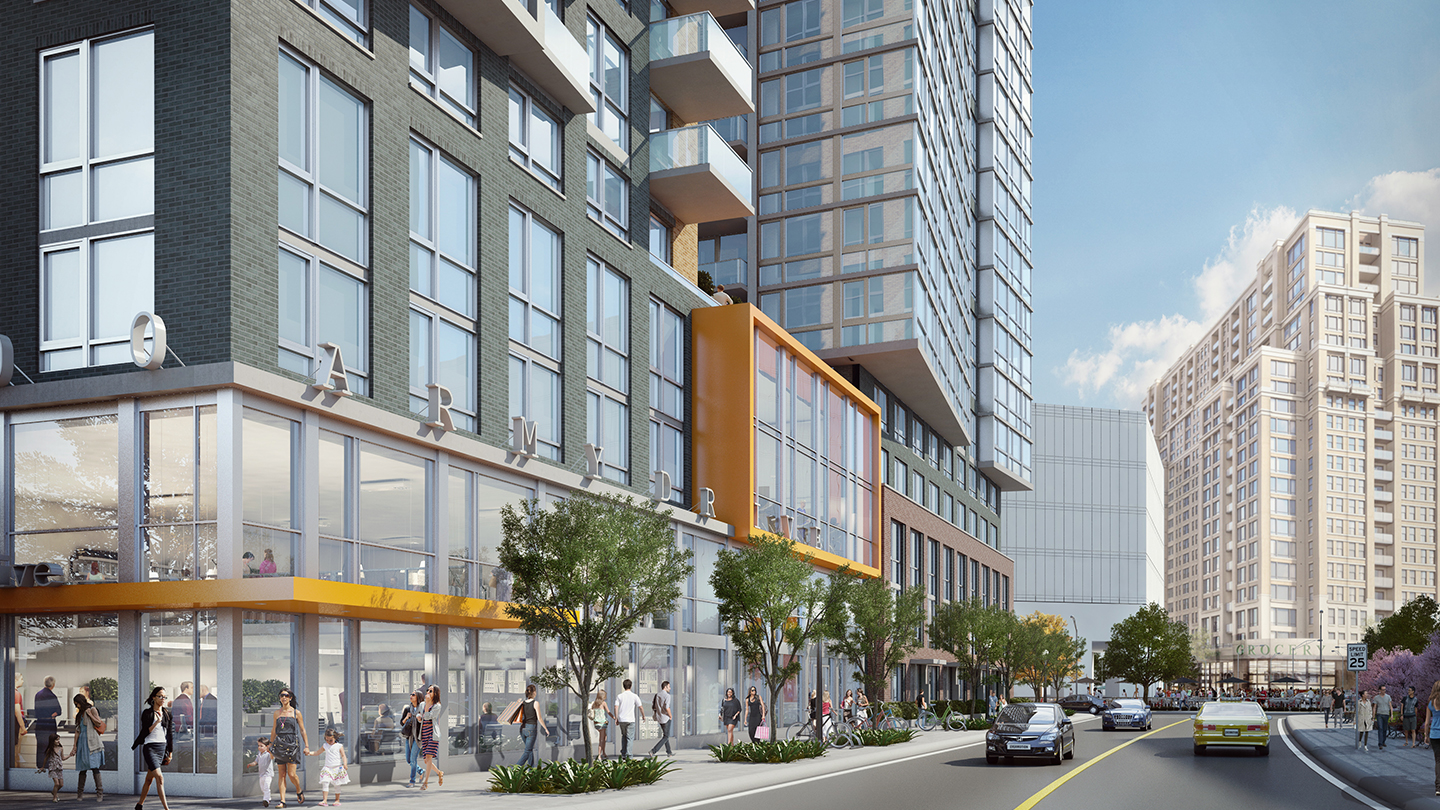 Un proyecto enfrentado al edificio del pentágono con cualidades de portal urbano. La fachada principal enfrentada a la autopista 295 y al pentágono y al Mall de Washington, jerarquiza las vistas con un par de planos vidriados de geometrÃa cóncava y un parasol-tabique-terraza que remata el edificio.