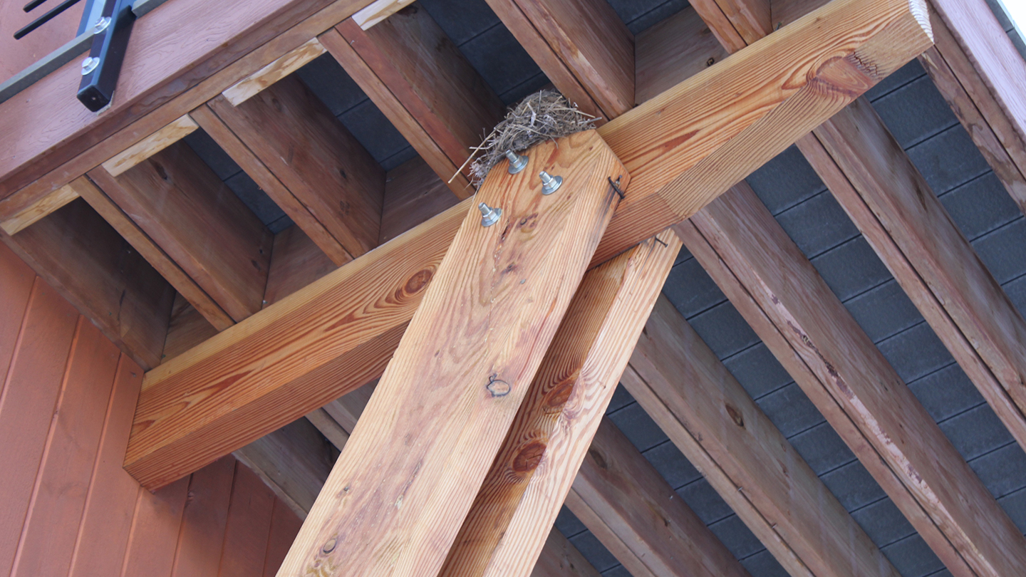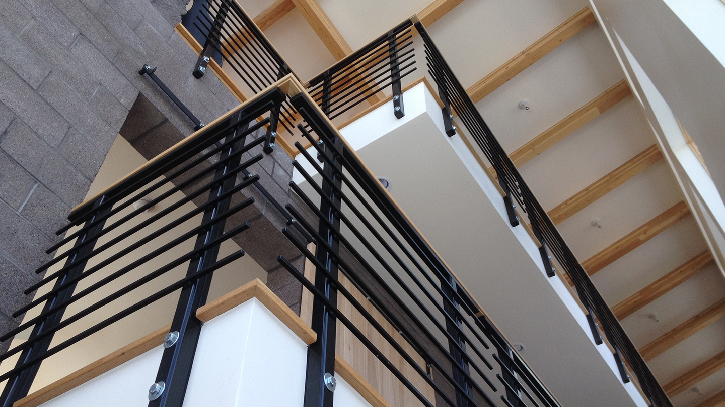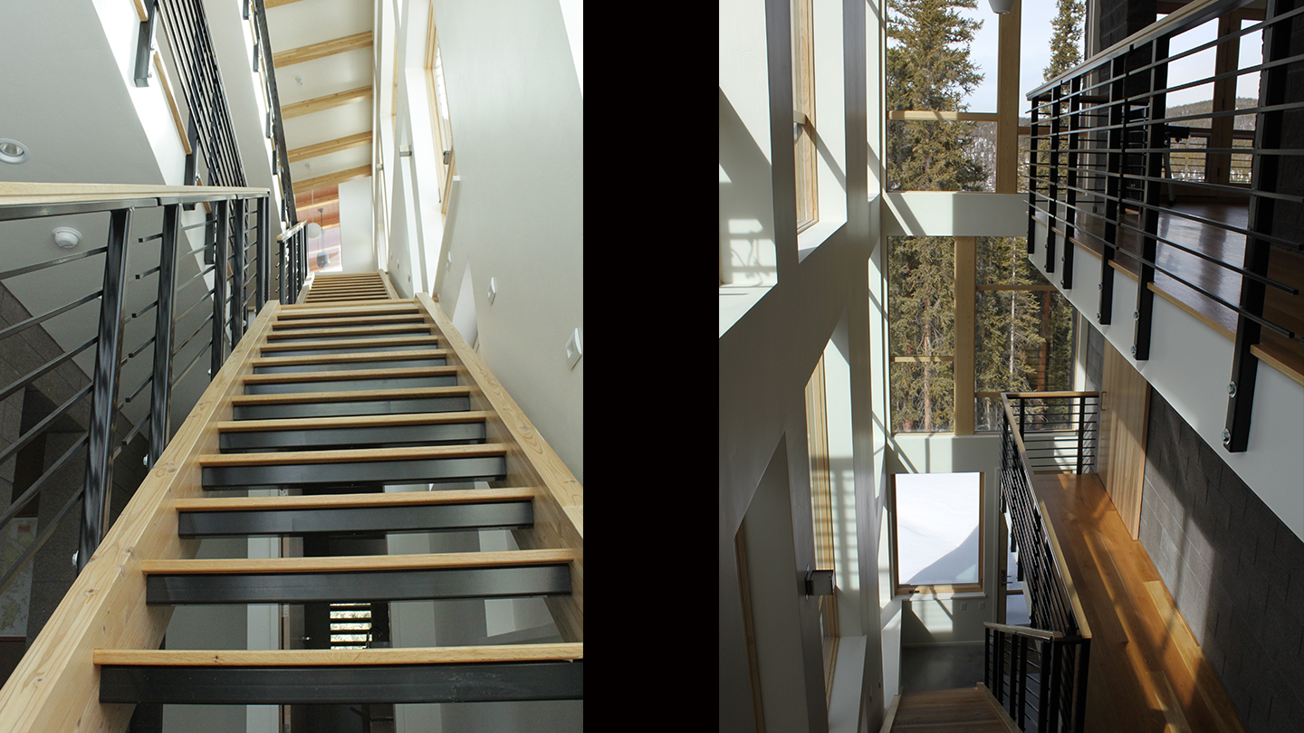 La cara oeste tiene una fachada vidriada sobre la cual se ubica el volumen de la escalera en todo su desarrollo. De esta manera se busca introducir la presencia del sol del oeste y el bosque dentro de la circulación y la vida cotidiana de la casa.