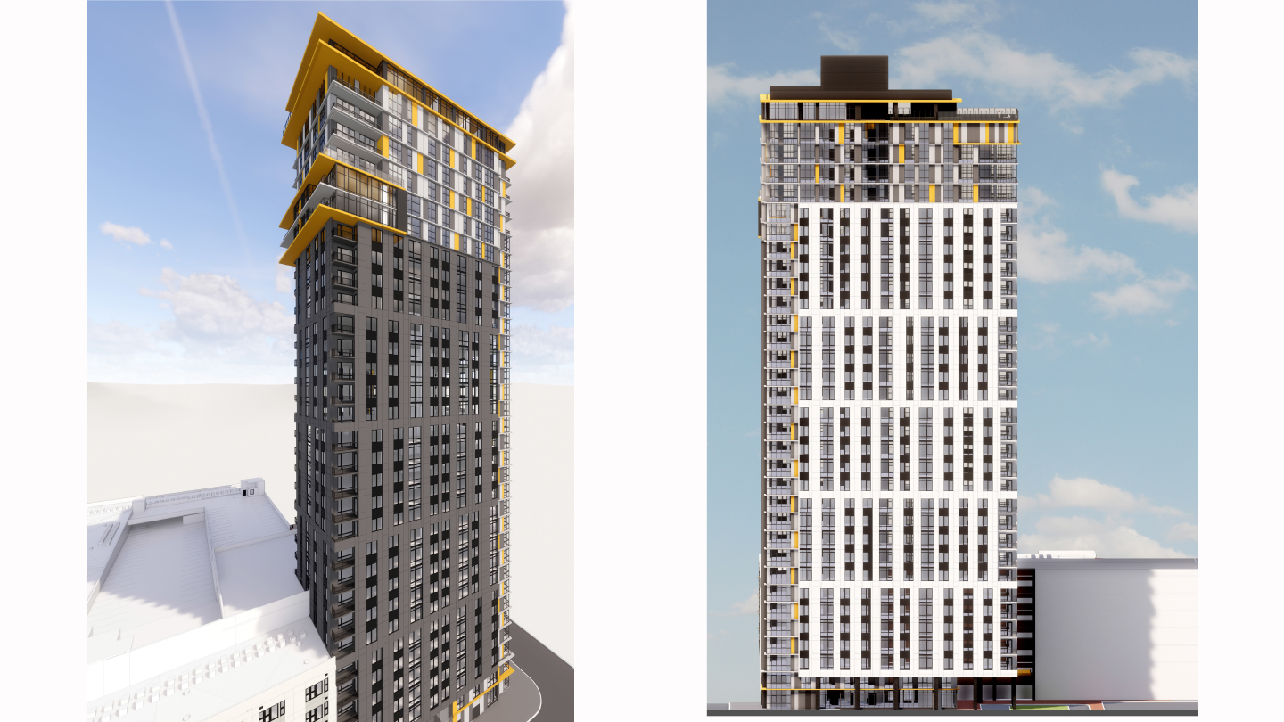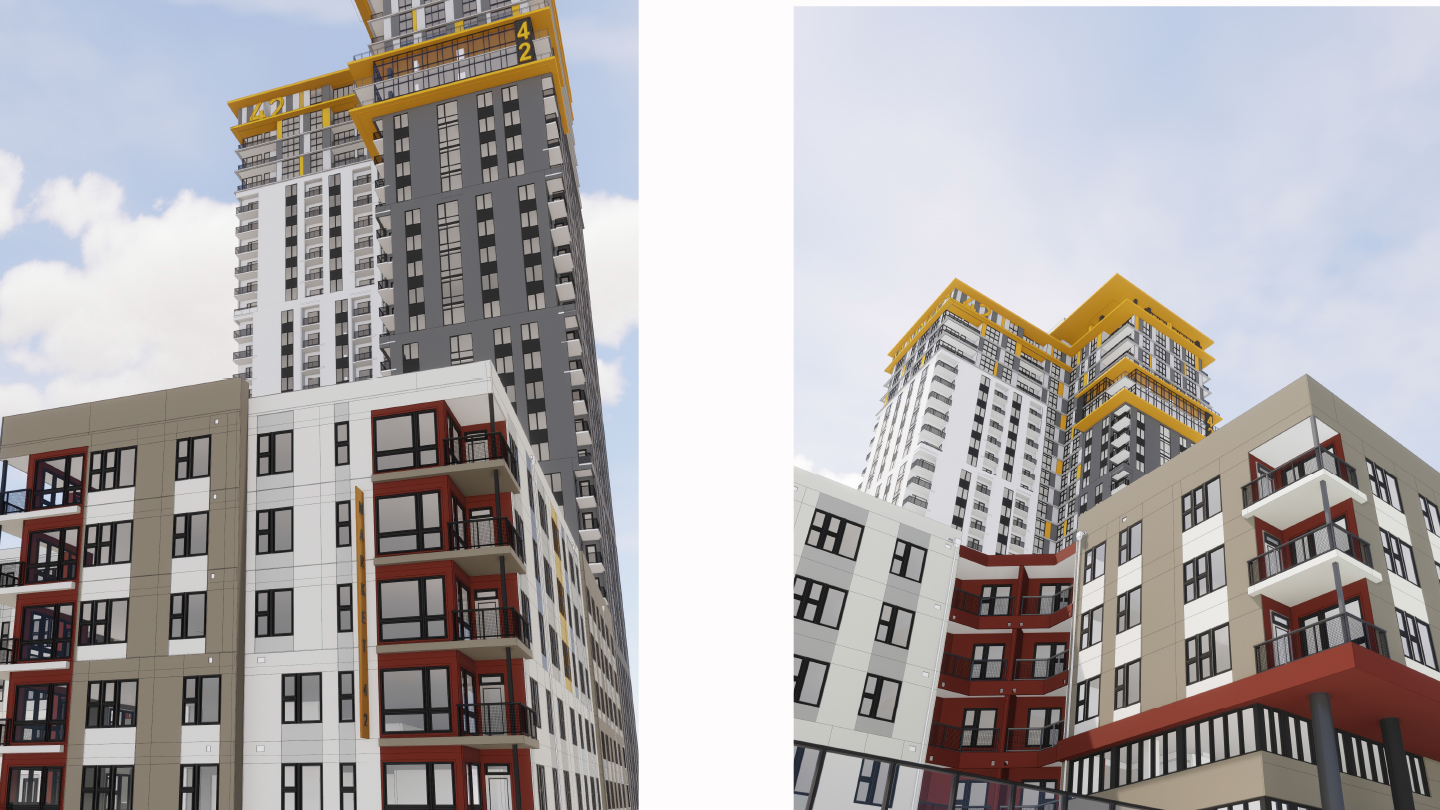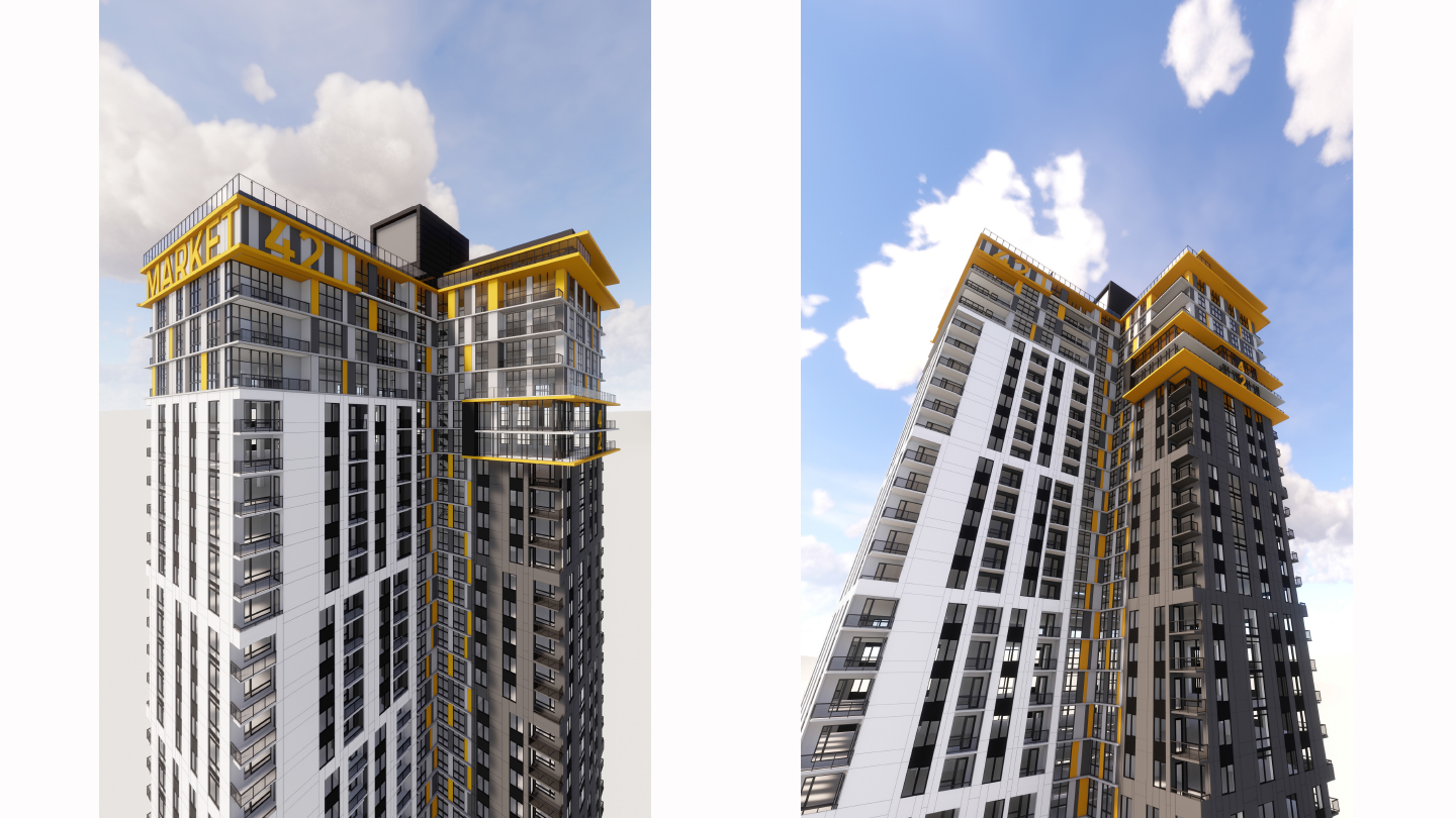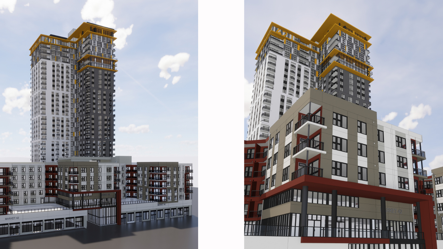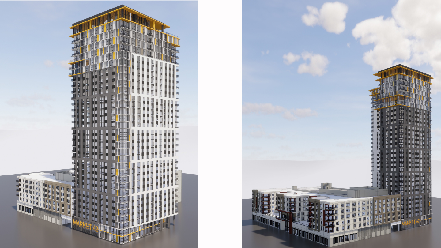 Este proyecto de 550 unidades y usos mixtos ocupara una manzana frente a la nueva lÃnea de tranvÃa adyacente al campus de la Universidad de Carolina del Norte en el centro de Charlotte. Es un proyecto de múltiples componentes: un garaje para 900 autos, un edificio residencial de 7 pisos, un edificio residencial de 33 pisos y un edificio de oficinas de 10 pisos. Hacia el sur, el podio comercial esta orientado hacia la calle privada-peatonal paralela al tranvÃa y su nueva estación. Vidrio y una fuerte banda horizontal separan la base y el edificio residencial. Una abertura con un Paseo divide la cuadra, conecta la calle con el garaje y crea un contrapunto con el volumen vidriado de las zonas comunes. El edificio residencial desarrolla un volumen en forma de “E†con patios abiertos al sol y las vistas. Las fachadas están articuladas con volúmenes contrastantes claros y oscuros, y acentos de color alternados. Hacia el norte, el edificio alto es una extrusión en forma de “Lâ€, la arquitectura celebra la volumetrÃa acentuando la diferencia entre las alas y el centro del edificio. Las alas tienen una expresión monocromática, sólida y vertical, mientras que el centro se expresa horizontal y con patrones mas vibrantes y coloridos. Fuertes voladizos de color y grafica de gran escala, acentúan las áreas de usos comunes en la base, desarrollo y remate del edificio, definiendo la futura identidad del edificio en la silueta urbana. Diseñado para KTGY Group