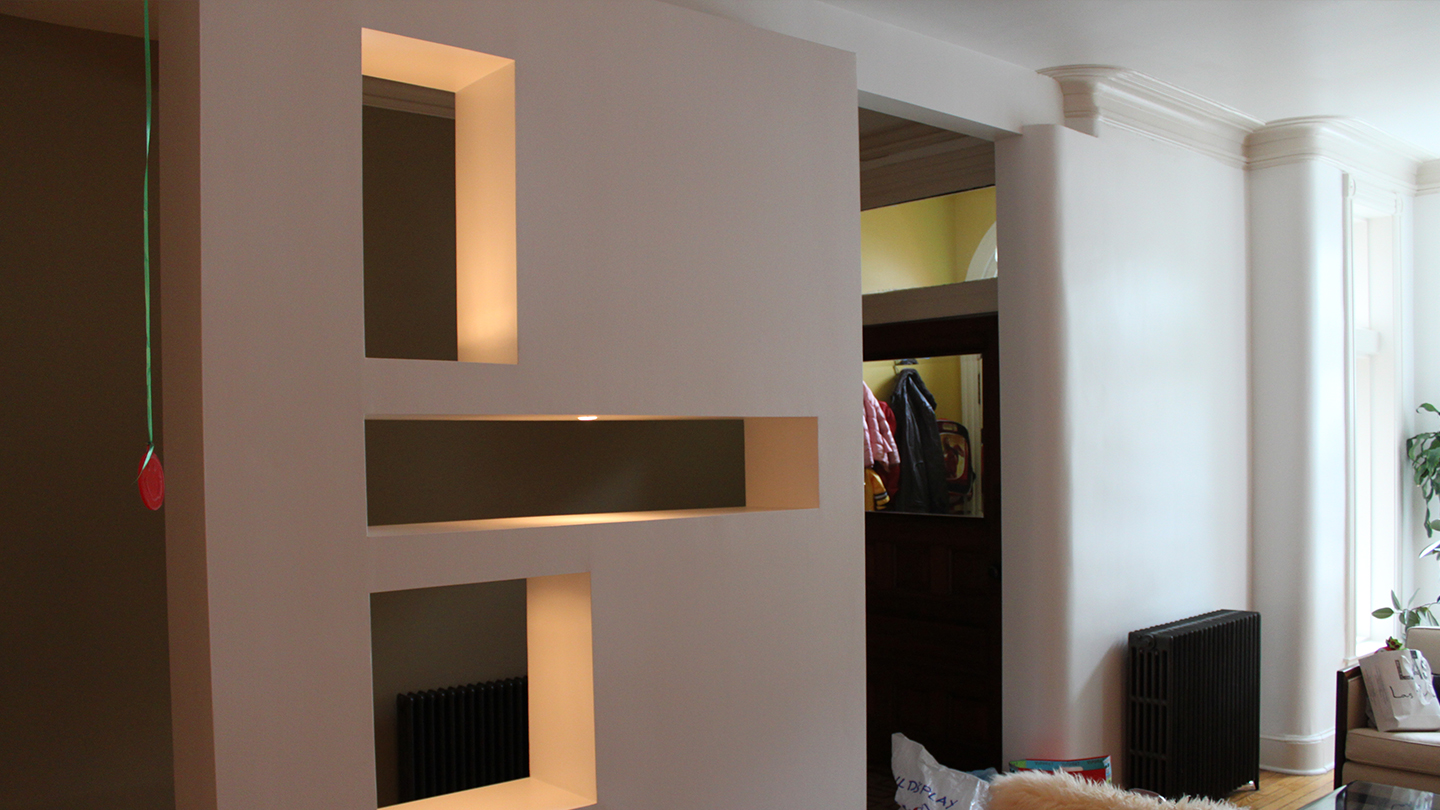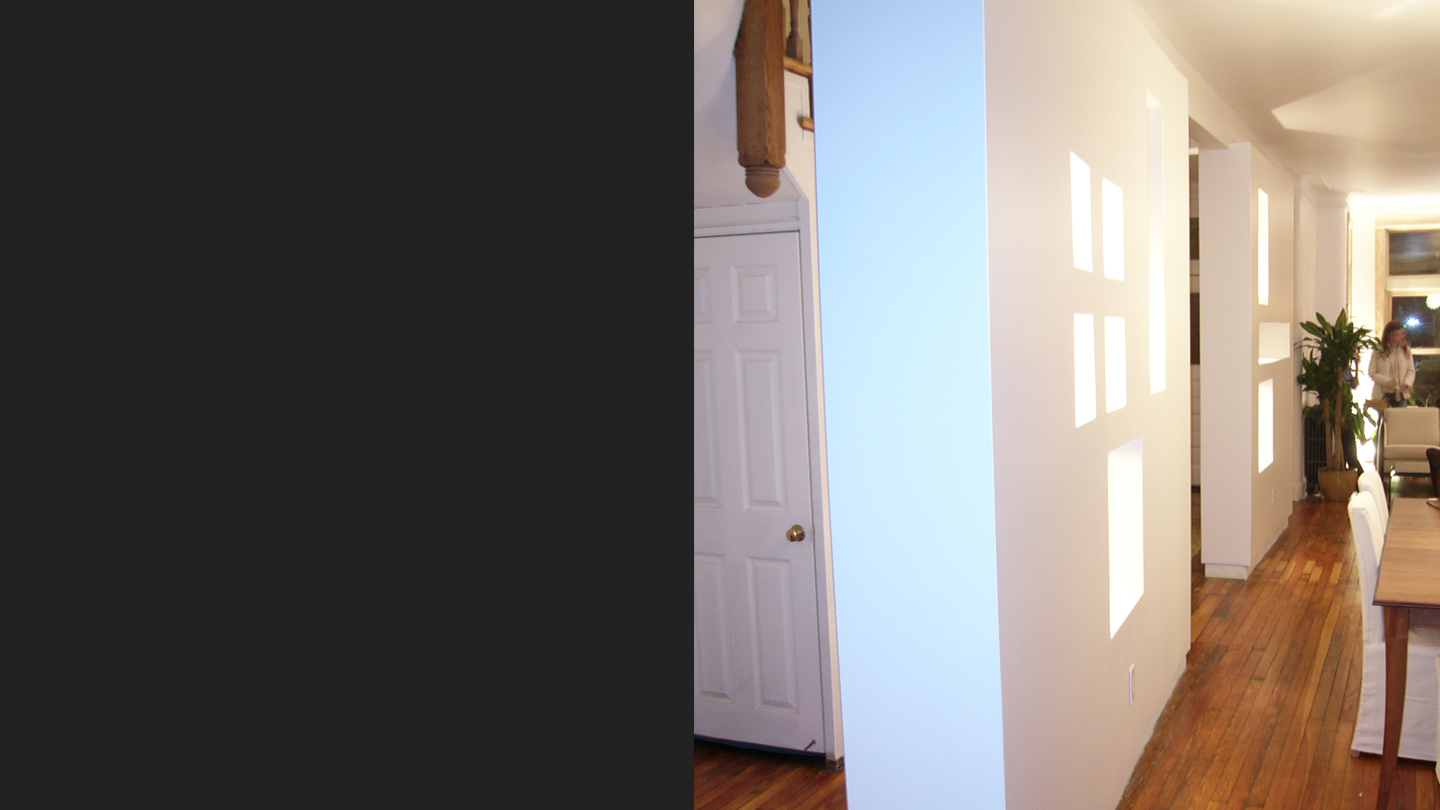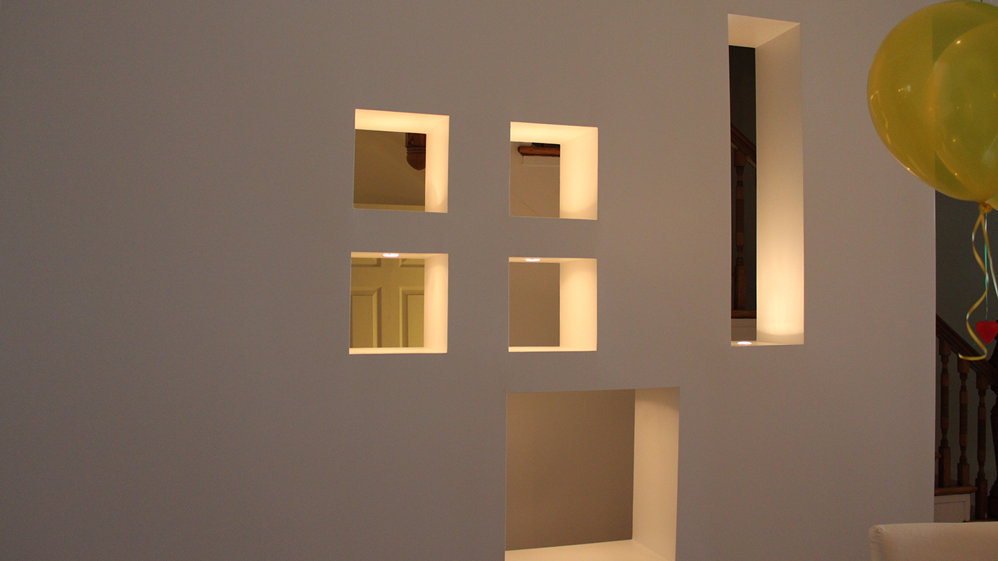La pared contiene huecos articulados irregularmente con iluminación indirecta, creando un efecto de estar flotando en el espacio.